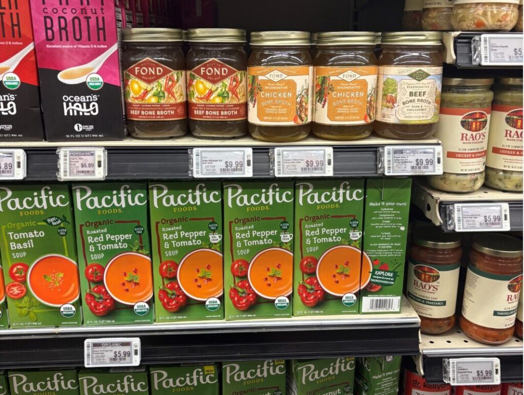 価格については、ミニトマトは2パックで$7、オーガニックスープは$12.99。全体的にはリーズナブルな価格帯で、一部のオーガニック商品の価格は高めに感じられるものの、ブランドが訴求する価値を踏まえると妥当であり、中間所得層を中心に支持される価格帯だと感じました。